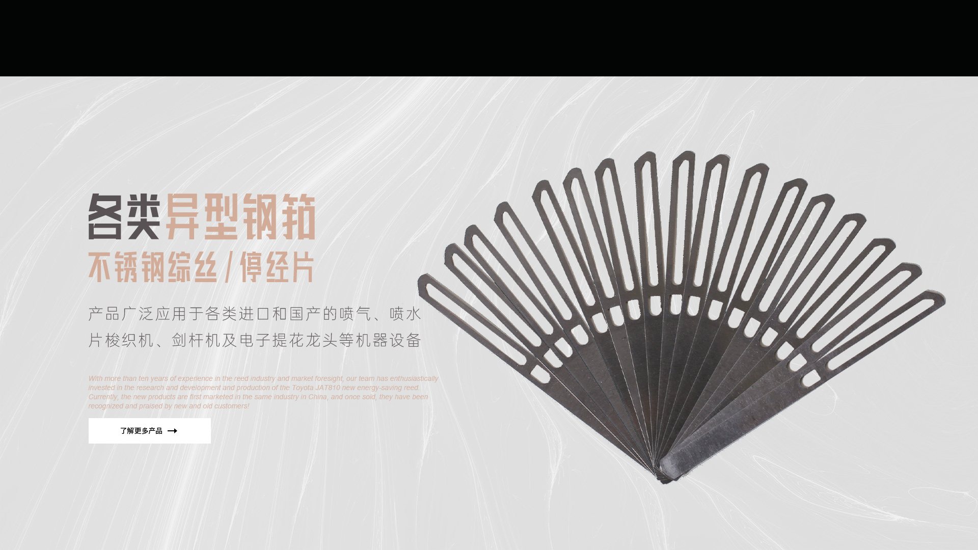 公司主要產品有:噴氣織機用各類異型鋼筘(傳統(tǒng)型豐田JAT710鋼筘及新研發(fā)的豐田JAT810節(jié)能筘);不銹鋼綜絲及不銹鋼停經片。我們的產品廣泛應用于各類進口和國產的噴氣、噴水、片梭織機、劍桿機及電子提花龍頭等機器設備。